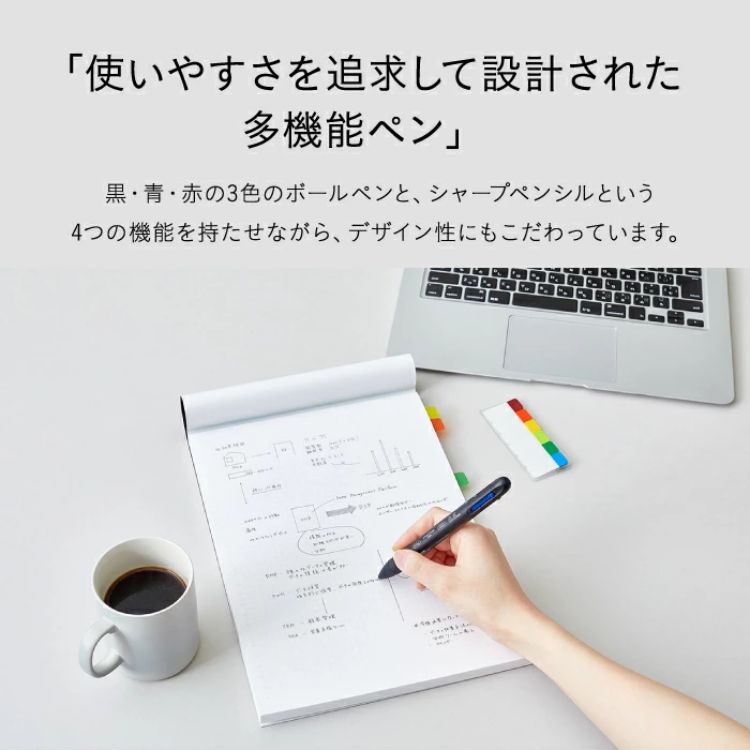 書きやすさに徹底的にこだわった形状をデザイン。持ち手にはすべりにくい素材を使用しています。芯をガードする独自の機構により、机から落とした程度では芯が折れにくいシャープペンシルです。