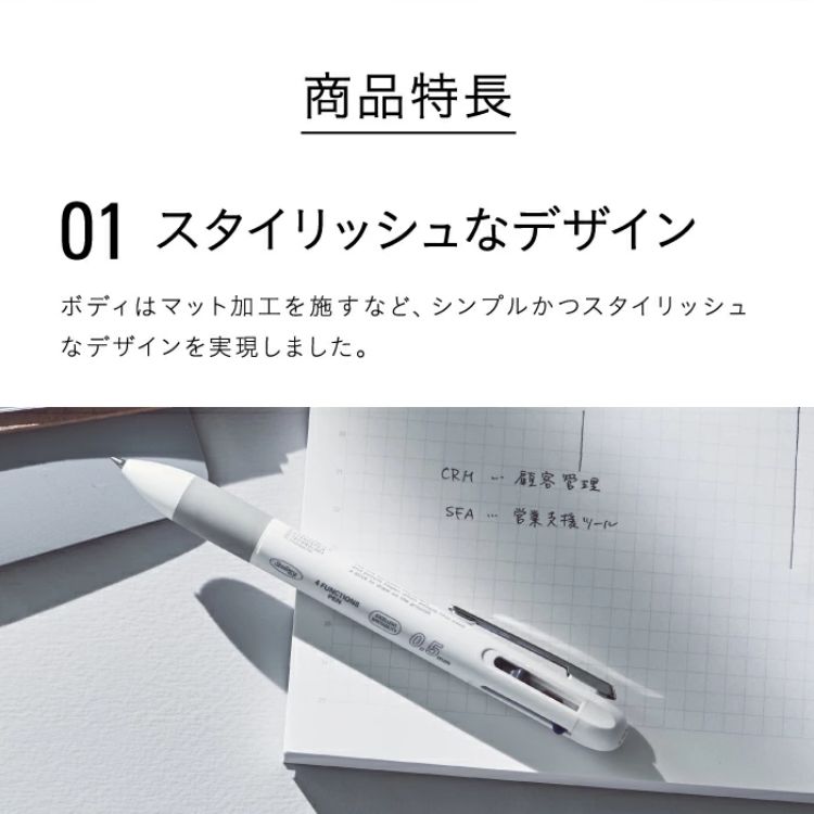 書きやすさに徹底的にこだわった形状をデザインしたボールペンです。持ち手にはすべりにくい素材を使用しています。独自の低粘度油性インクで滑らかな書き心地を実現しました。従来、英語を書くのには適しても、「止め」や「はね」のある日本語を書くにはさらさらしすぎていた低粘度インクに、ほどよい粘性を持たせ、ストレスなく書けるように調整しています。