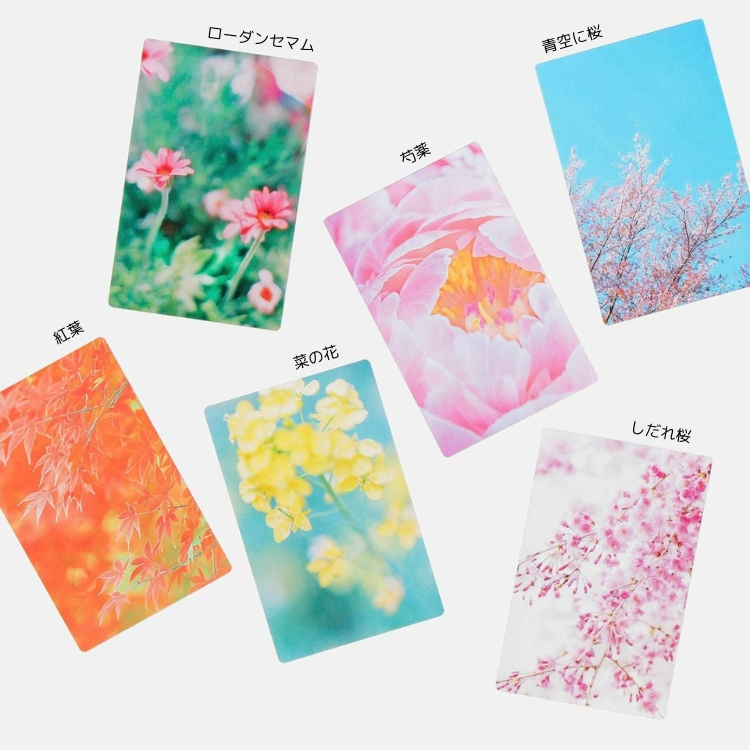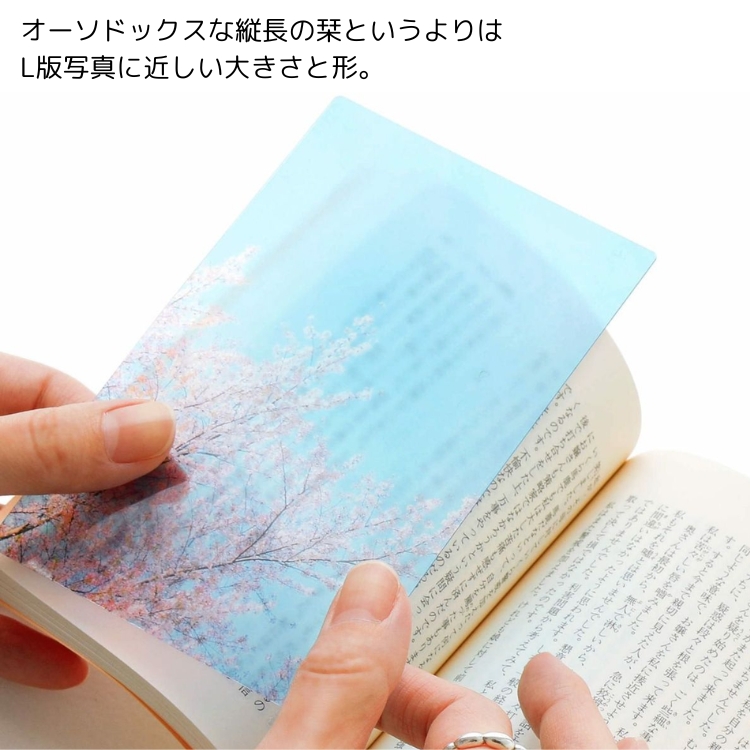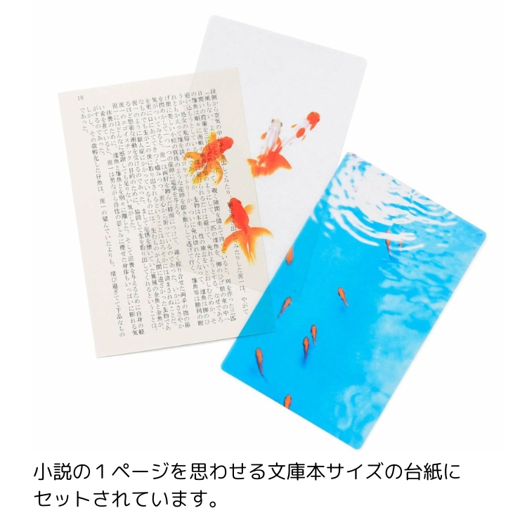 A6判よりも少し小さい、文庫本用にちょうどいいサイズ。金魚や花々などの身近な被写体から風景まで幅広く揃う、本好きには言わずと知れた人気シリーズ。本に挟むと下地が透けて、文字の世界を鮮やかに彩ります。手頃なお礼やお返しとしてや、本好きなあの人へのギフトにもぴったりです。