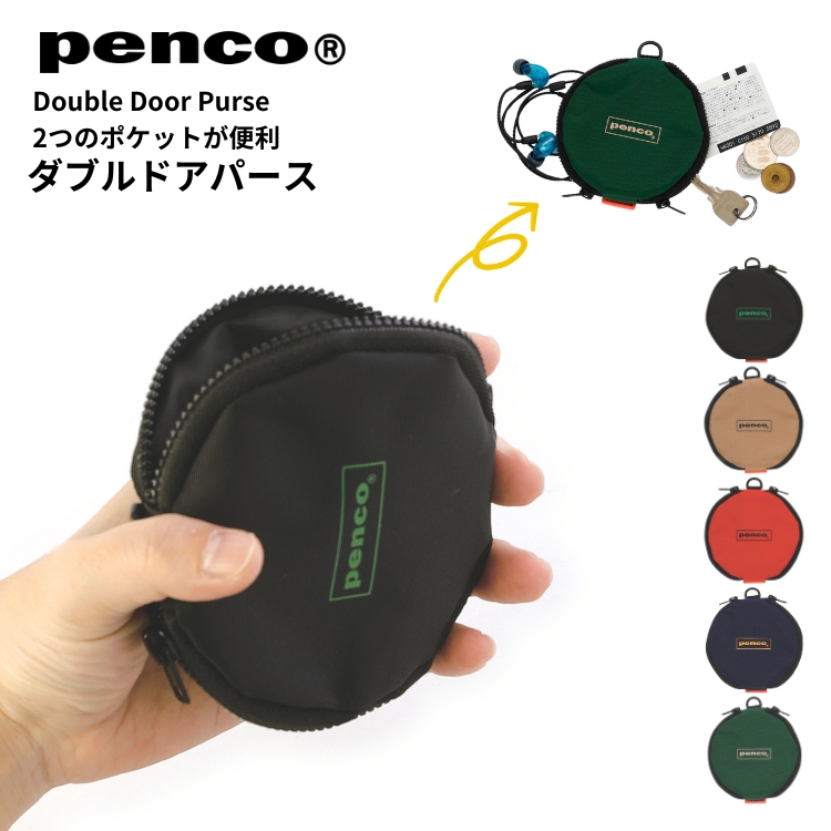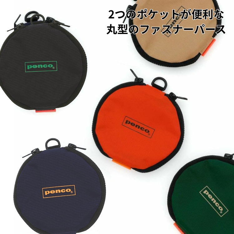 penco(ペンコ)のダブルファスナーパースです。丸型ポーチの両サイドにそれぞれで独立したポケットがついたユニークな仕様で、小銭やカード、身の回りの小物などを分けて収納することができます。また、Dカンが付いているので、チャームを付けたり、別売りのコードストラップなどを通してネックポーチとしも使用可能です。