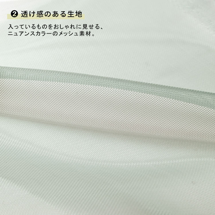 透け感、重なる。たっぷり2層タイプのマルチポーチしっかり収納できるポケットと、中身が見える半透明のメッシュポケットの2層式マルチポーチ。メッシュポケットにはお気に入りのアイテムを入れて見せる収納を楽しめます。ペンケースやコスメポーチ、ガジェットケースにも。バイカラーやタグのデザイン、透け感にこだわったおしゃれに持てるアイテムです。