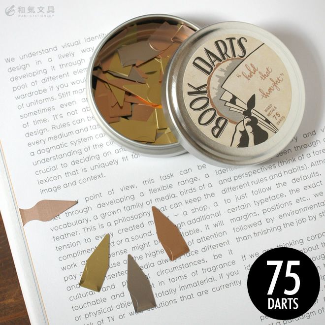 とても薄くて邪魔にならないアメリカ生まれのブックダーツ/BOOKDARTS。沢山使いたい人にも嬉しい75個入り缶・3色ミックス♪です。読みかけの本のページだけでなく行までピンポイントでマークキングできる優れもの。クラシカルな雰囲気が素敵です♪ 付箋として…字は書けませんが、何よりスタイリッシュ!いっぱいつけてもスマートで、 クリップとしても、しおりとしてもお使いいただけます。薄くてかさばらず、シッカリとまって傷もつきません。 モレスキンとの相性は格別です。