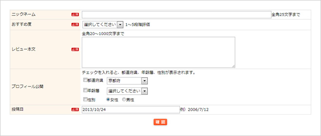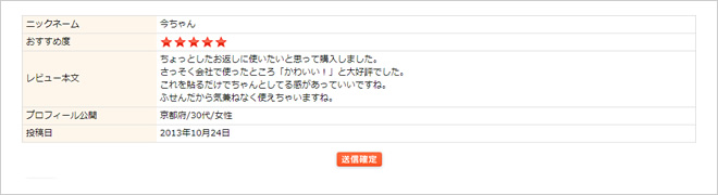 内容を確認し【送信確定】ボタンを押すとレビュー投稿完了です。