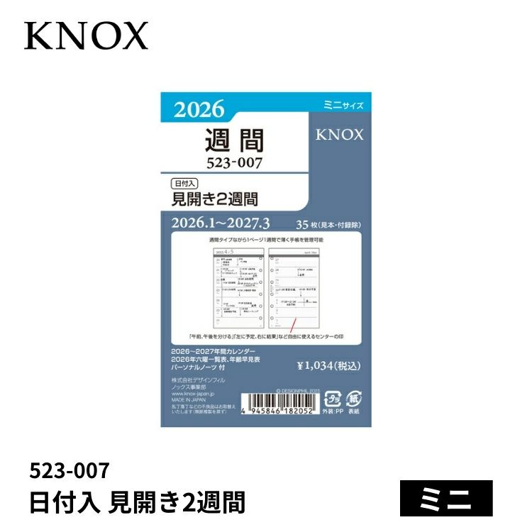他の画像を見る 【ミニ】システム手帳リフィル 手帳 2026年 ノックス システム手帳 リフィル 日付入 見開き2週間 ミニ 523-007 価格 ¥ 1,034 税込 カートに入れる お気に入りに登録する