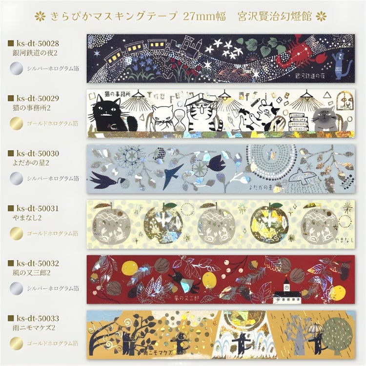 他の画像を見る 「宮沢賢治幻燈館」シリーズ第1弾の箔押しマスキングテープ シール堂 きらぴかマスキングテープ 宮沢賢治幻燈館 15mm幅 vol.3 箔押し 和紙 価格 ¥ 330 税込 カートに入れる お気に入りに登録する