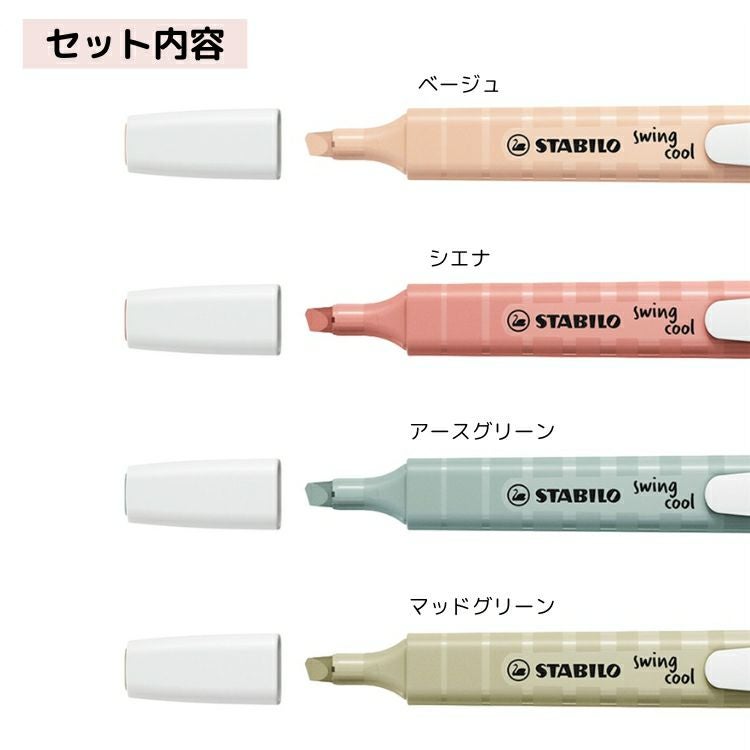 他の画像を見る 綺麗にマーキングできるペン スタビロ STABILO スイングクール ネイチャーカラー 4色セット マーカー 蛍光ペン ◇ 価格 ¥ 792 税込 在庫切れ 詳細を見る お気に入りに登録する