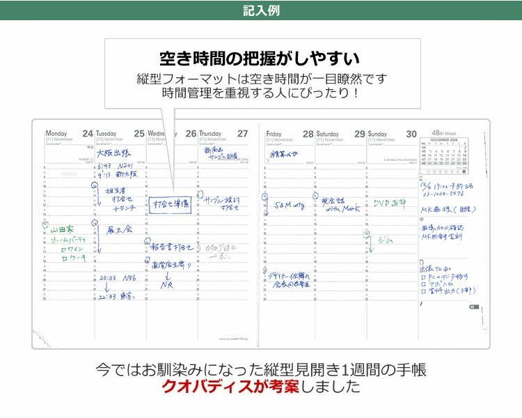 他の画像を見る 手に馴染みやすいサイズが人気のダイアリー 2026年 手帳 クオバディス 週間 バーチカル[時間軸タテ]10×15cm ビジネス クラブ【メール便送料無料】 / 名入れ可能[有料] メール便無料 価格 ¥ 3,740 税込 詳細を見る お気に入りに登録する