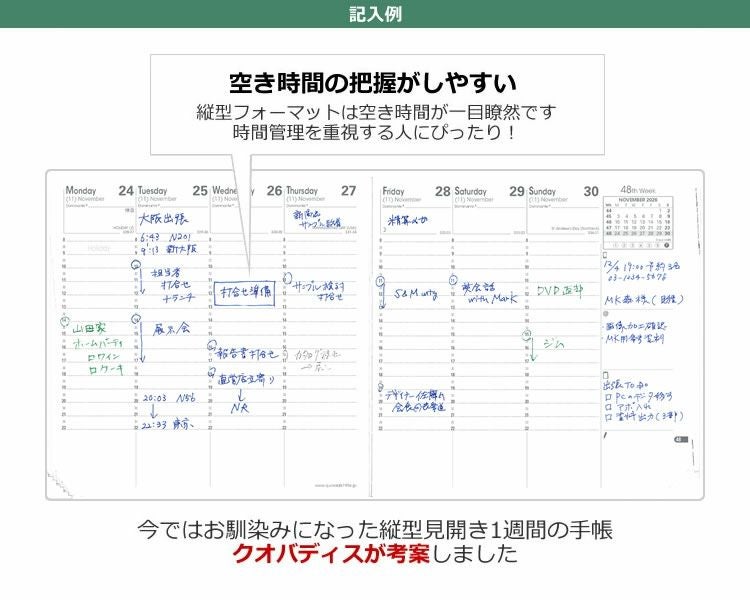 他の画像を見る 手帳 2026 4月始まり スケジュール帳 クオバディス 手帳 4月始まり 2026年 クオバディス 週間 バーチカル[時間軸タテ]10×15cm ビジネス4 ソーホ【メール便送料無料】 メール便無料 価格 ¥ 3,960 税込 カートに入れる お気に入りに登録する