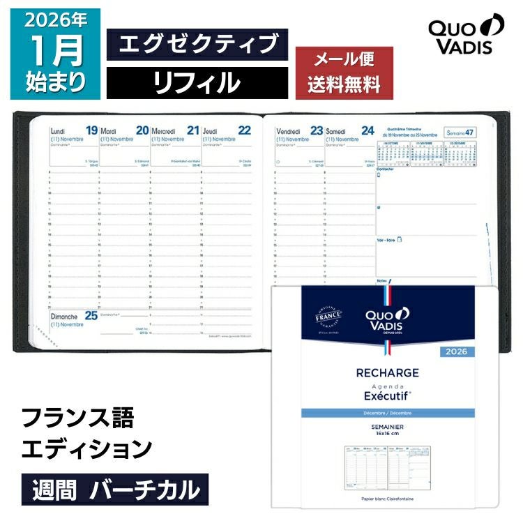 他の画像を見る 【リフィルのみ】2026年 エグゼクティブ フランス語 2026年 手帳 クオバディス 週間 バーチカル[時間軸タテ]16×16cm正方形 エグゼクティブ リフィル[レフィル]フランス語エディション【メール便送料無料】 ◇ メール便無料 価格 ¥ 3,520 税込 カートに入れる お気に入りに登録する