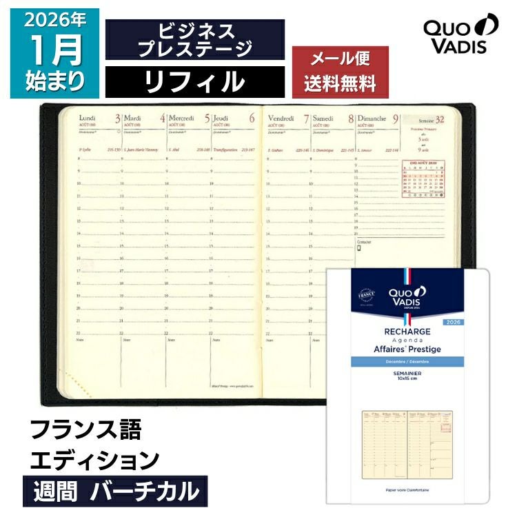他の画像を見る 【リフィルのみ】2026年 ビジネスプレステージ フランス語 2026年 手帳 クオバディス 週間 バーチカル[時間軸タテ]10×15cm ビジネスプレステージ リフィル[レフィル] フランス語エディション【メール便送料無料】 メール便無料 価格 ¥ 2,860 税込 カートに入れる お気に入りに登録する