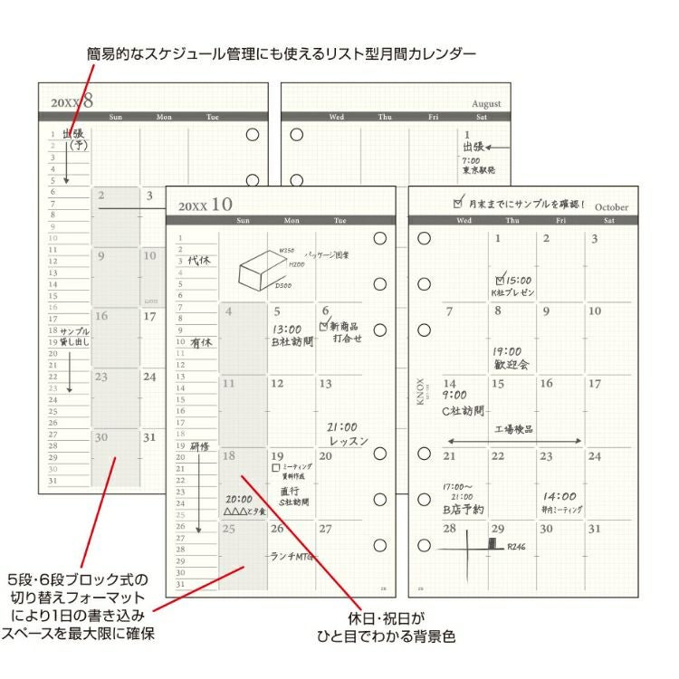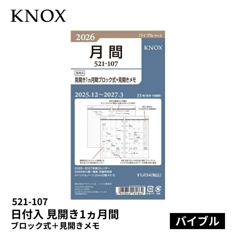 他の画像を見る 【バイブル】システム手帳リフィル 手帳 2026年 ノックス システム手帳 リフィル 日付入 見開き1ヵ月間ブロック式日曜始 バイブルサイズ 521-103 価格 ¥ 660 税込 在庫切れ 詳細を見る お気に入りに登録する