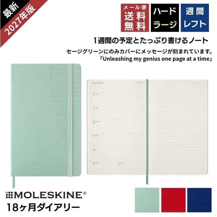 モレスキン 手帳 2027年 18ヶ月 ダイアリー 7月始まり 週間 レフト ウィークリー ハードカバー ラージ カラーカバー【メール便送料無料】 2026年7月-2027年12月
