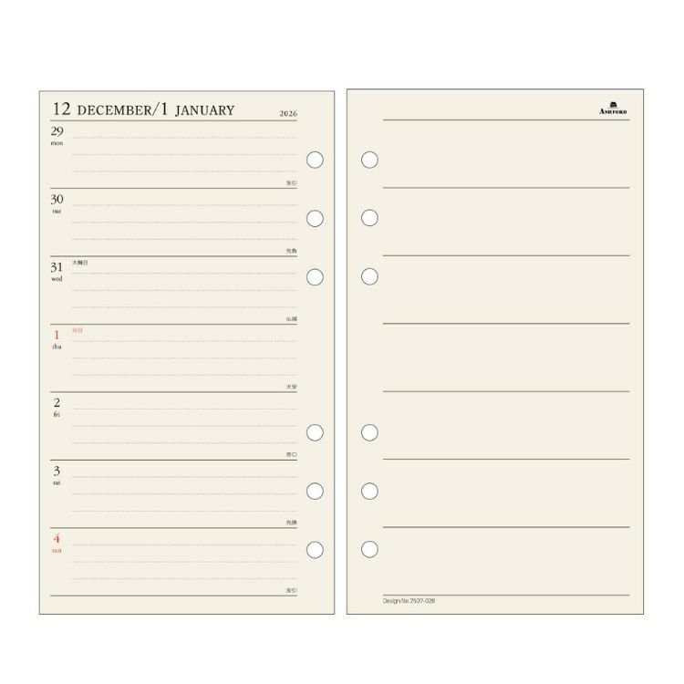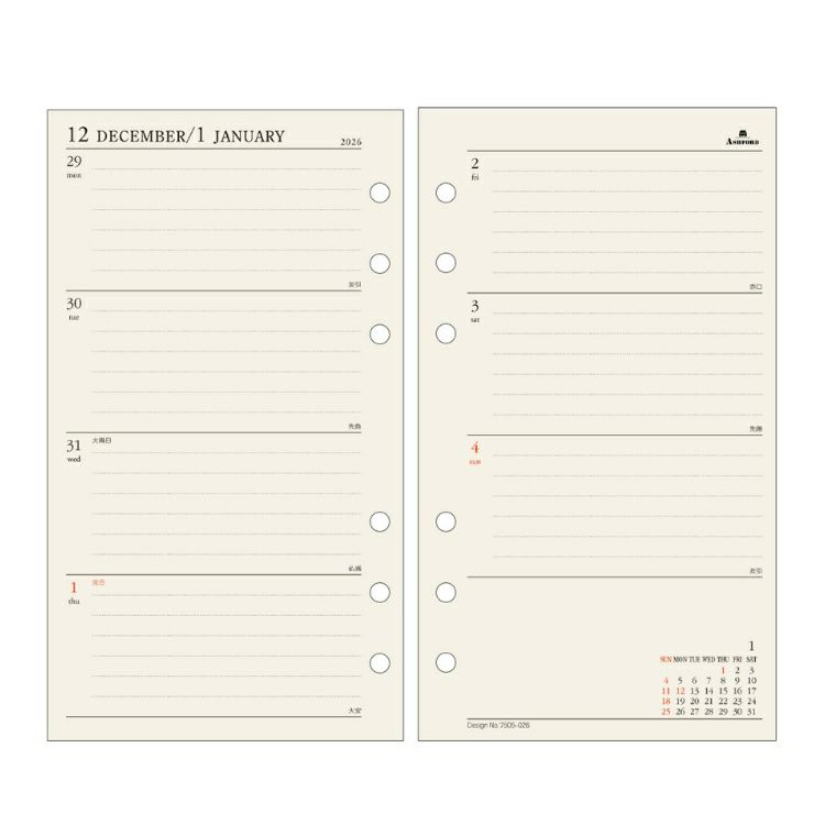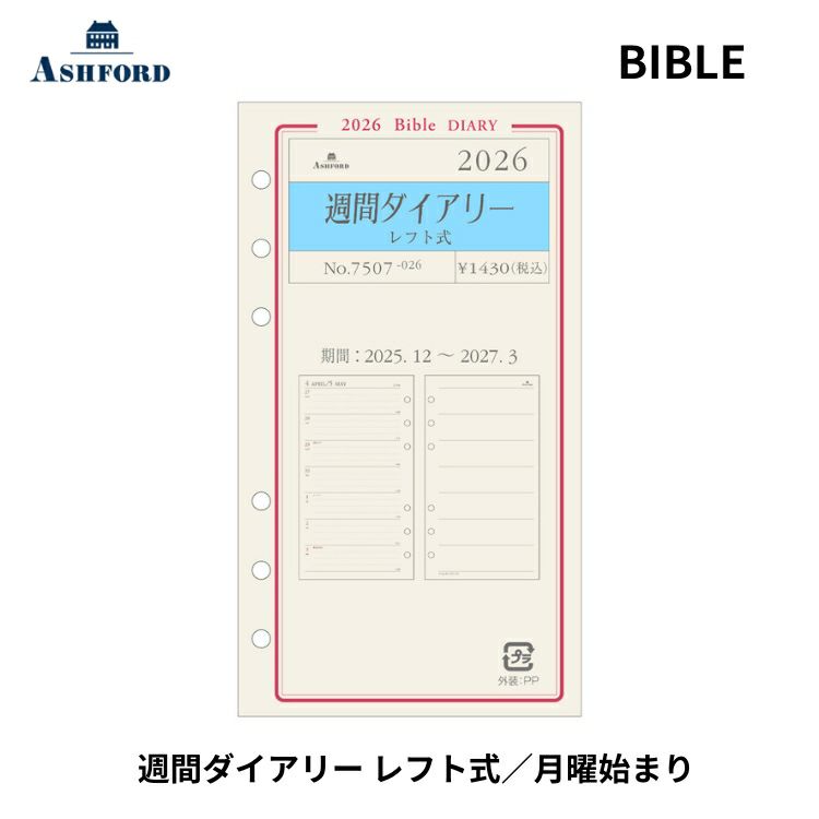 他の画像を見る 【BIBLE リフィル】週間レフト 月曜日始まり 手帳 2026年 アシュフォード ASHFORD システム手帳 バイブル リフィル 週間ダイアリー レフト式 BIBLE 7507-026 ◇ 価格 ¥ 1,430 税込 在庫切れ 詳細を見る お気に入りに登録する