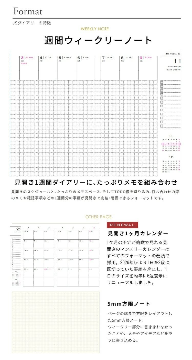 他の画像を見る 2026年 手帳 JSダイアリー A5 週間 ウィークリーノート【レーザー名入れ無料】【メール便送料無料】 2025年11月始まり[2025年10月27日から使用可] ◇ メール便無料 名入れ対応 価格 ¥ 3,300 税込 詳細を見る お気に入りに登録する