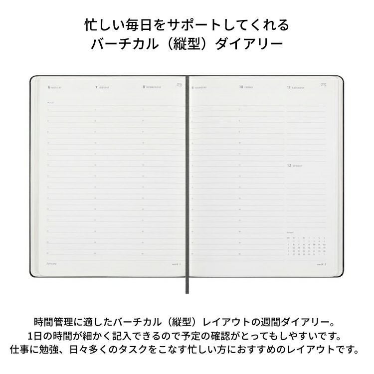 他の画像を見る 【週間バーチカル】プロダイアリー/Xラージ ブラックカバー 祝日シール付 2026年 手帳 1月始まり モレスキン プロダイアリー 週間 バーチカル[時間軸タテ]Xラージサイズ ブラック【レーザー名入れ無料】【メール便送料無料】 ◇ メール便無料 名入れ対応 価格 ¥ 6,050 税込 在庫切れ 詳細を見る お気に入りに登録する