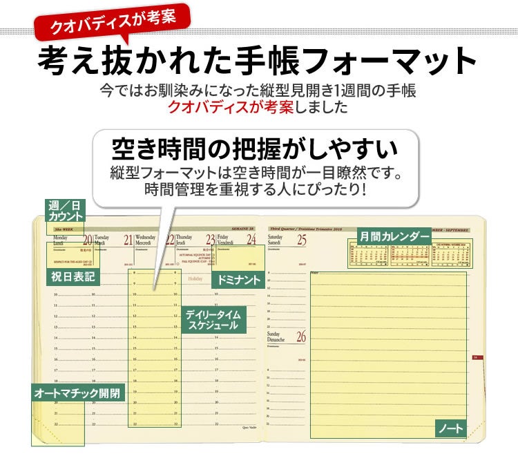 他の画像を見る 手帳/クオバディス/フランス/週間/ビジネスサイズ 手帳 4月始まり 2026年 クオバディス 週間 バーチカル[時間軸タテ]10×15cm ビジネスプレステージ4 リフィル[レフィル]【メール便送料無料】 ◇ メール便無料 価格 ¥ 2,860 税込 カートに入れる お気に入りに登録する