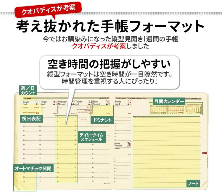 他の画像を見る クオバディス 2026 手帳 ダイアリー スケジュール帳 2026年 手帳 クオバディス 週間 バーチカル[時間軸タテ]10×15cm ビジネス 本革[スプリットレザー]カバー デュオ【名入れ 無料】 ◇ 価格 ¥ 9,680 税込 在庫切れ 詳細を見る お気に入りに登録する