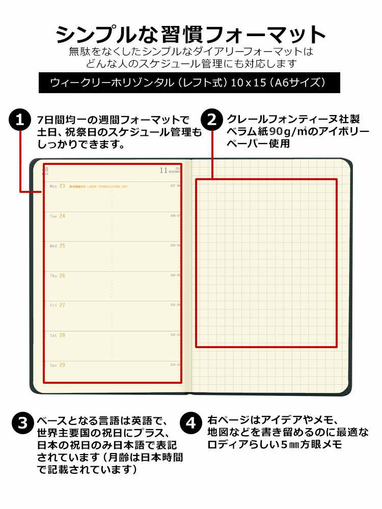 他の画像を見る 無駄を抑えたシンプルなウィークリーフォーマット 手帳 2026年 ロディア 週間 ウェブプランナー ウィークリーホリゾンタル[レフト式] 10×15[A6サイズ]【名入れ 無料】【メール便送料無料】 メール便無料 名入れ無料 価格 ¥ 3,080 税込 詳細を見る お気に入りに登録する