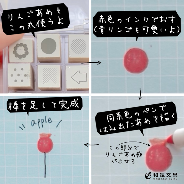 2つ目も同じ丸スタンプを使ってりんごあめを作りました!インクパッドはバーサマジックのGD12。インク色を変えるだけで一気に違うモチーフに変わりました♫ポイントは上にはみ出たあめ部分を描き足すこと。りんごあめって上の方が平らになっているのですが(そしてそこが美味しい…!)デコでもその部分を描くと本格的!