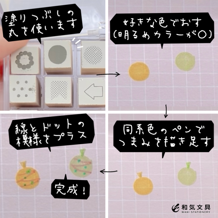 まずは塗りつぶしの丸を使ったアレンジです。インクパッドの色を存分に楽しめるのが塗りつぶしの良いところ!色を決める時点からワクワクしますね。水ヨーヨーのポイントはヨーヨー本体は明るめ(やや薄め)カラーを使うこと。模様を足して完成なデコなのでペンが埋もれないカラーがおすすめです。