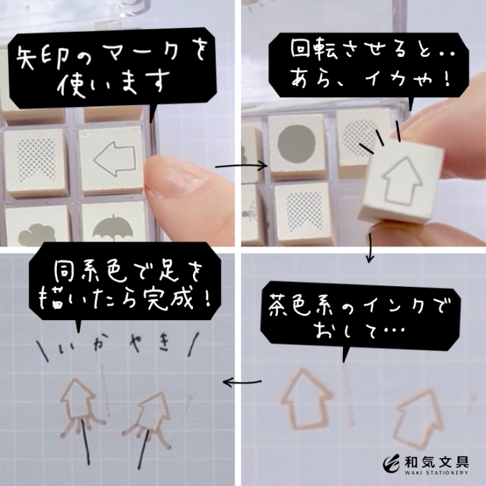 次使うのはなんと矢印の形!くるっと回転させるとイカのような形だな?と思いデコに取り入れてみました(^-^)/茶色系でおすとまさにイカやき!棒と足をプラスして完成です。使用したインクパッドはバーサマジックのGD62です。