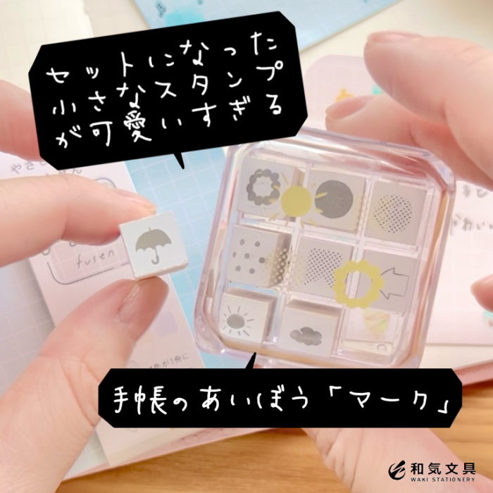使うのは小さなスタンプが9個セットになった手帳のあいぼう。種類は「マーク」です。画像のように、手に取るととっても小さなサイズ感!印面は7mm×7mmのなのでカレンダーのちょっとした隙間にもポンっと押せる気軽さです。この「マーク」の柄は太陽や雲などのお天気や丸やドットなどニュアンス使いしやすい形が入っているのでアレンジしがいがある♫さっそく使って縁日デコをしていきます〜!
