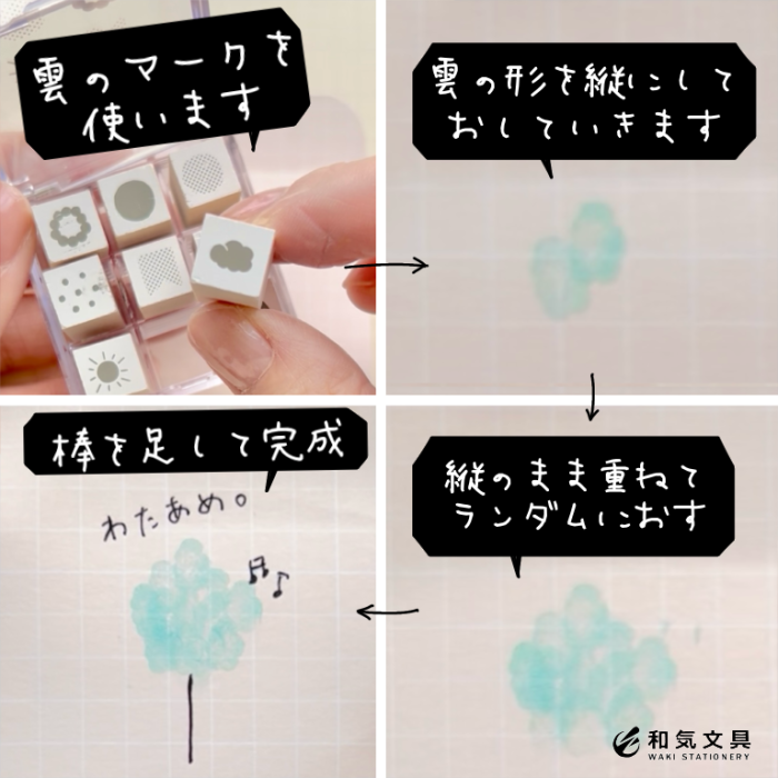 ここからは変化球。この形をこう使うんだ!と思ってもらえたら嬉しいです♫わたあめは雲の形と縦にしてランダムに重ねるとそれっぽく仕上がります。かすれてもOK!逆にかすれた部分がある方がふわふわ感を出せます。使ったインクパッドはバーサマジックのGD37。